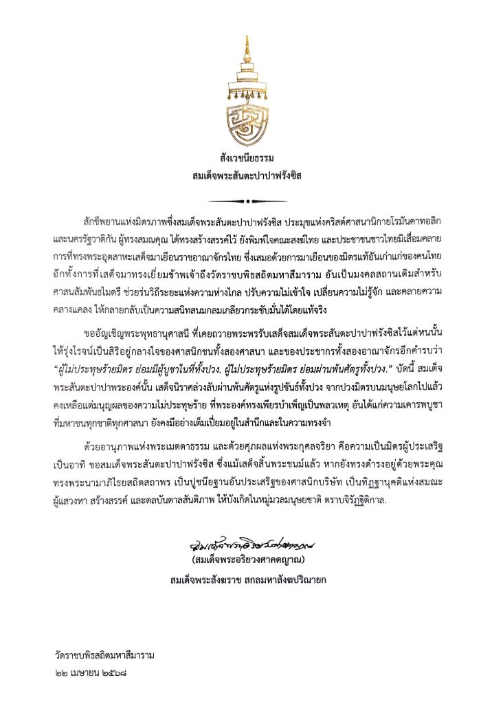 สังเวชนียธรรม จากสมเด็จพระอริยวงศาคตญาณ สมเด็จพระสังฆราช สกลมหาสังฆปริณายก เนื่องในการสิ้นพระชนม์ของ สมเด็จพระสันตะปาปาฟรังซิส ณ นครรัฐวาติกัน เมื่อวันจันทร์ที่ ๒๑ เมษายน พ.ศ. ๒๕๖๘