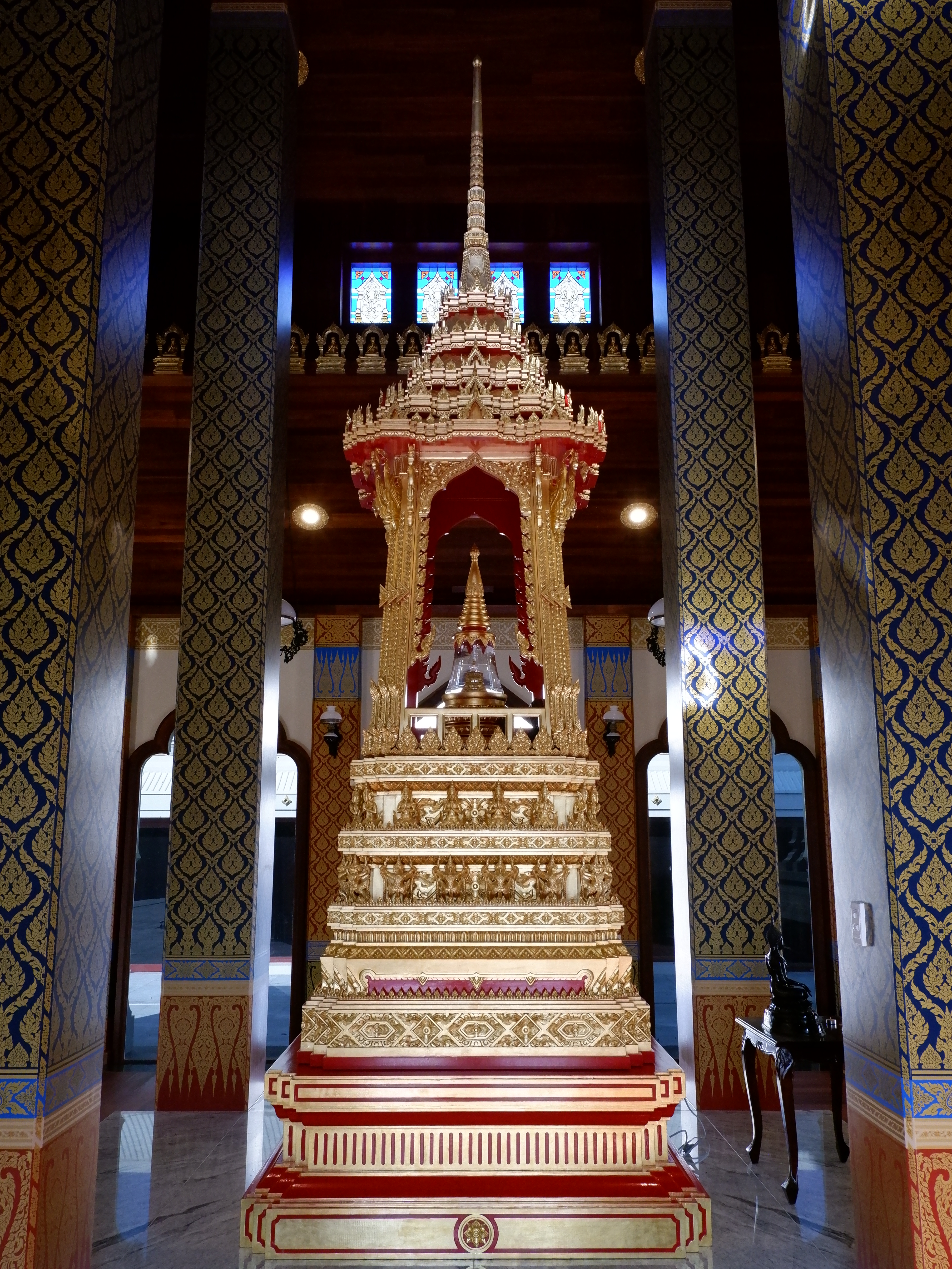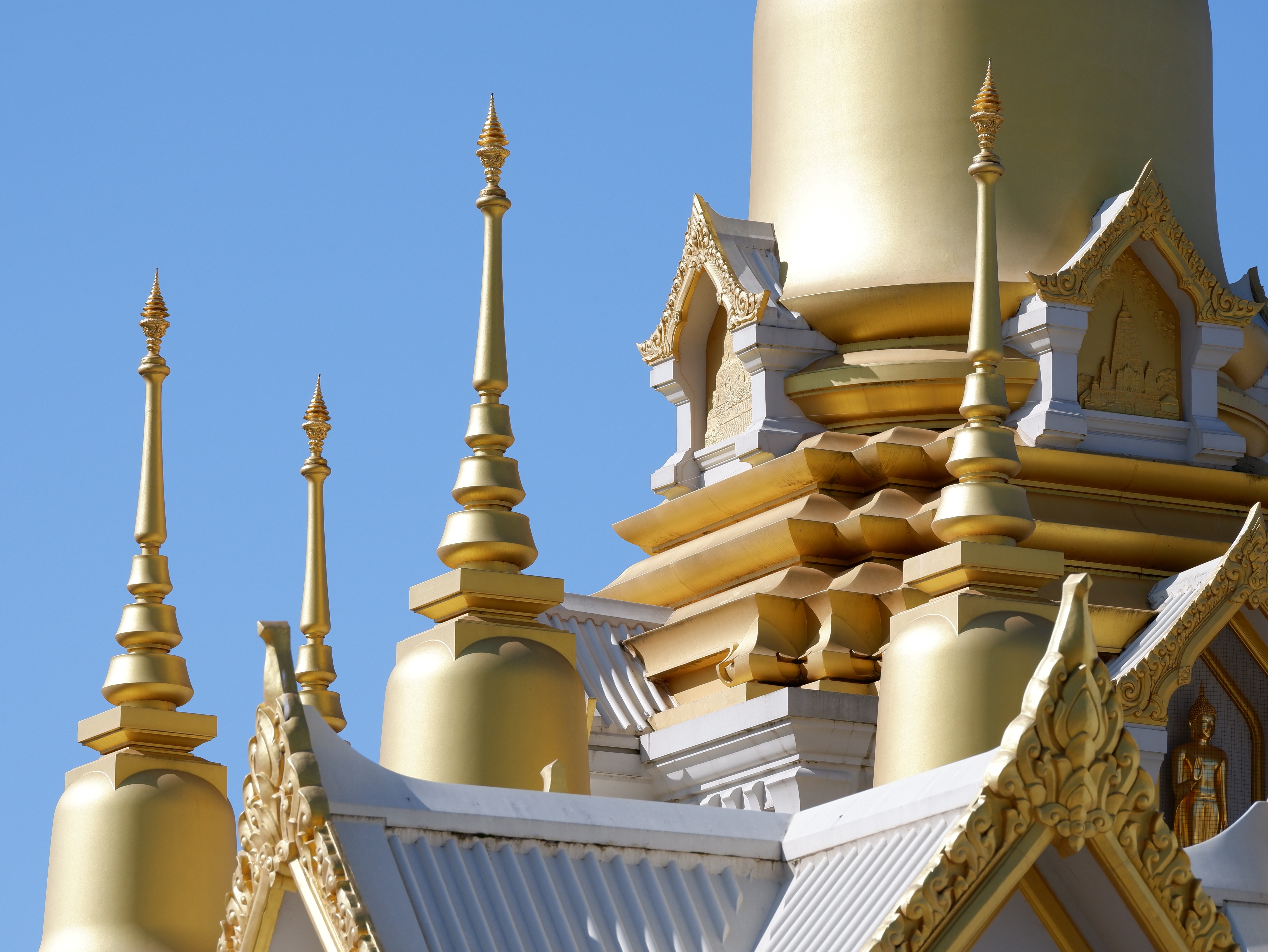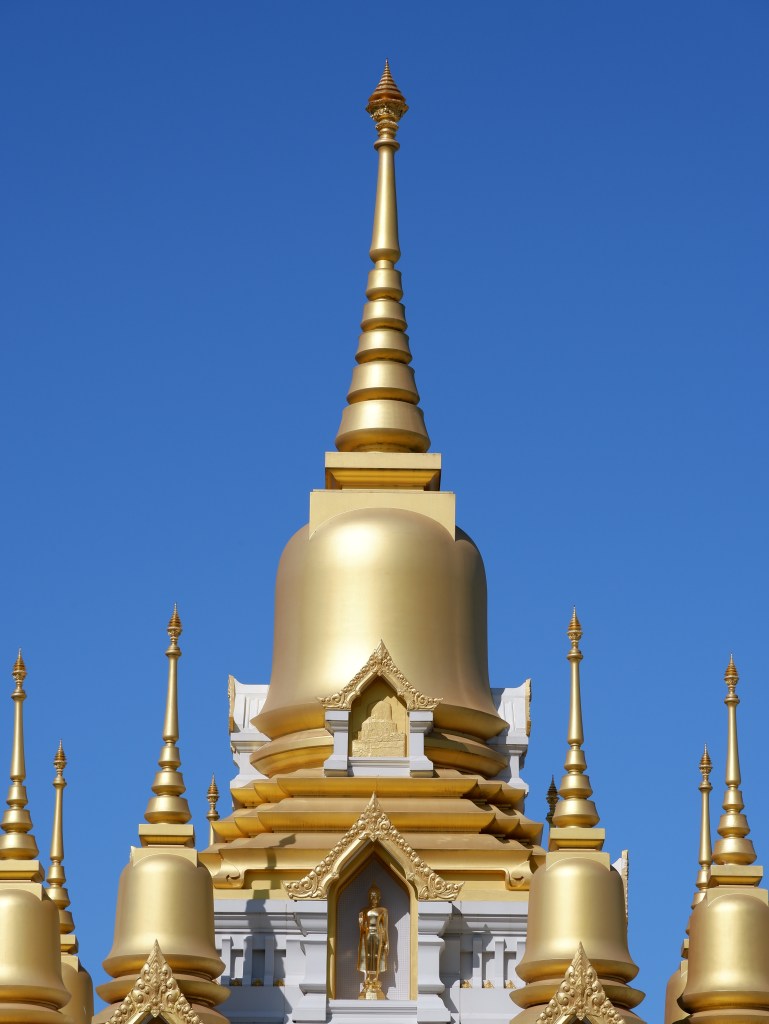 This Stupa has a total of nine spires representing the Buddha and Eight Arahants or Enlightened disciples of the Buddha. Relics of the Buddha are enshrined at the top of the main spire as well as within the Busabok Throne inside the accessible Stupa hall. Various relief sculptures and Buddha images on top of the Stupa convey significant events in the life of the Buddha.